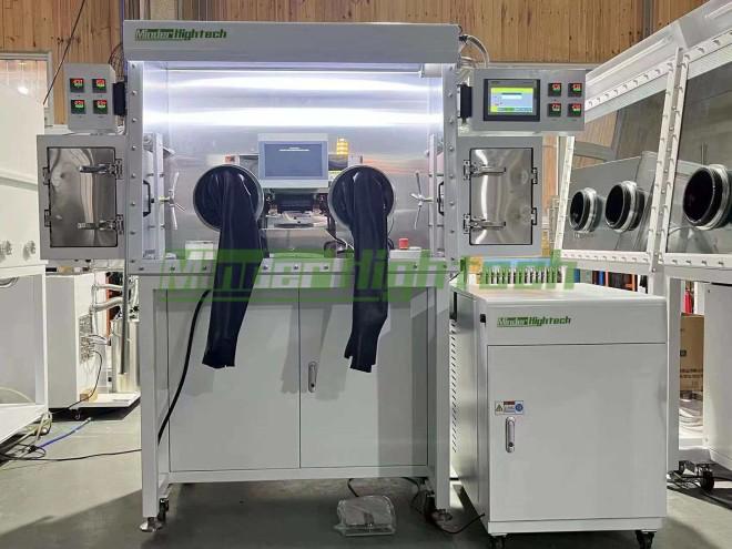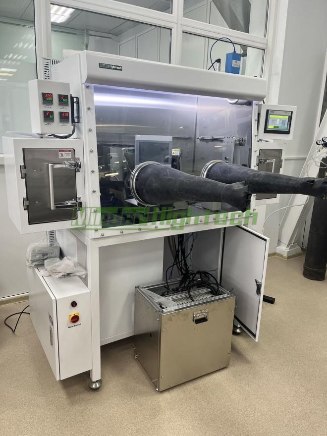 The working gas in the glove box is between the chamber and the purification column (H2O and O2 adsorber), and it is closed circulated through pipes, circulation blowers, etc. under the control and monitoring of PLC. When the working gas circulates through the purification column, its moisture and oxygen are adsorbed and then returned to the chamber. As the cycle time passes, the H2O and O2 content of the working gas in the chamber will gradually decrease and eventually reach the index of less than 1 ppm. The purification column will saturate after a certain period of cycle, and can be regenerated and reused.