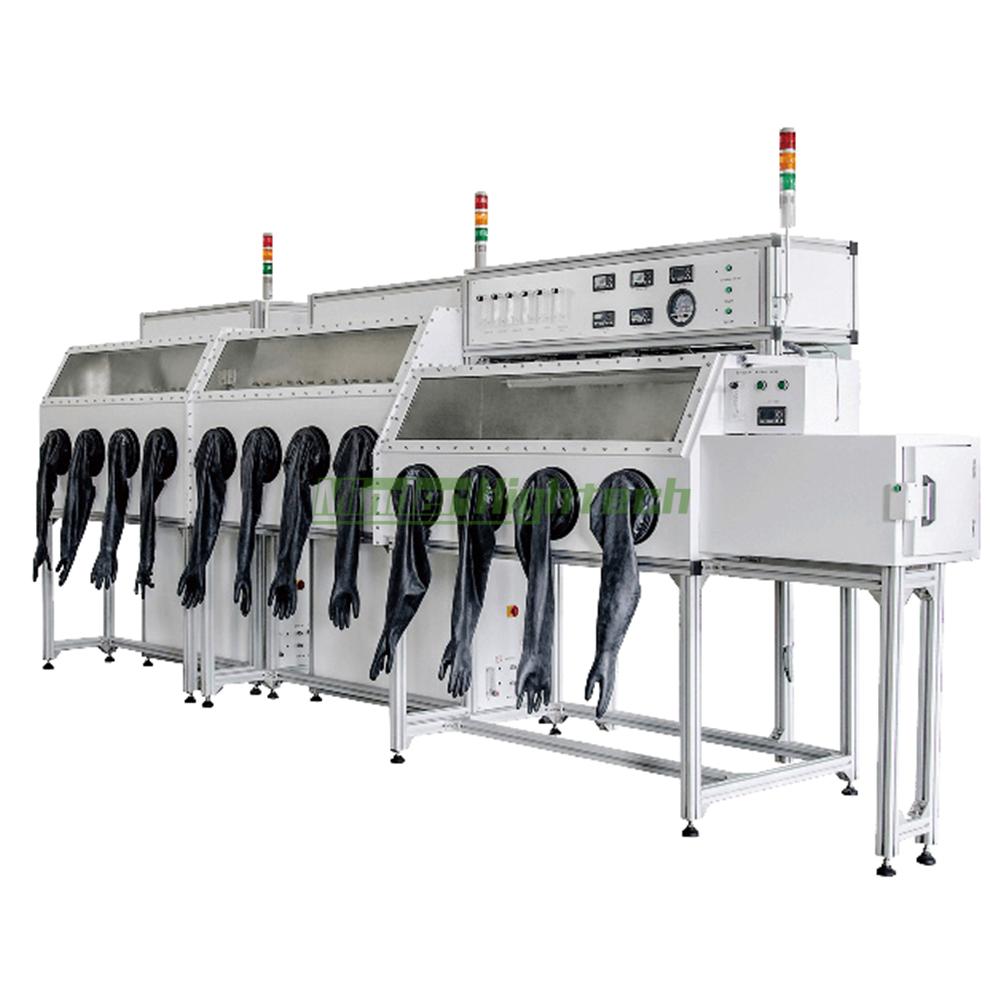 The working gas in the glove box is between the chamber and the purification column (H2O and O2 adsorber), and it is closed circulated through pipes, circulation blowers, etc. under the control and monitoring of PLC. When the working gas circulates through the purification column, its moisture and oxygen are adsorbed and then returned to the chamber. As the cycle time passes, the H2O and O2 content of the working gas in the chamber will gradually decrease and eventually reach the index of less than 1 ppm. The purification column will saturate after a certain period of cycle, and can be regenerated and reused.
